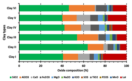 The chemical composition of clays studied in this research work is shown in Figure 7, where it can be observed that SiO2 and Al2O3 are the most abundant oxides in all six clays. Clay II has the highest amount of SiO2 while Clay V has the minimum quantity of SiO2, which is related to the presence of quartz in the clay specimen. The lowest and highest quantity of Al2O3 can be observed in Clay V (13.26%) and Clay VI (24.14%), respectively. It noteworthy that Clay VI is the only clay type with Al2O3 greater than 20%, which can be ascribed to the presence of Kaolinite. However, Clay I shows abnormal characteristic, wherein it has a lower amount of Al2O3 as compared to other clay types but still has kaolinite in the XRD patterns (see Section 3.1.2). Apart from SiO2 and Al2O3, an appreciable amount of CaO, iron (III) oxide (Fe2O3), MgO, sodium oxide (Na2O), and potassium oxide (K2O) are also present, with traces of sulfur trioxide (SO3), titanium dioxide (TiO2), phosphorous pentoxide (P2O5), and manganese oxide (MnO).