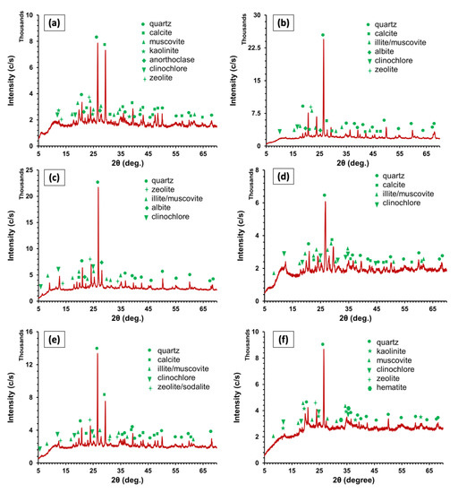 The XRD patterns of Clay I–VI are displayed in Figure 8a–f, where the quantitative and qualitative phase assessment of multiphase mixtures is carried out. Like XRD patterns of industrial wastes, the ICDD database was used to determine the XRD peaks of the clays used in this study (see Table A1 in Appendix A). Figure 8a–f shows that all clay types have major peaks against quartz, calcite, clinochlore, illite/muscovite, and zeolite, with some minor peaks of albite, anorthoclase, kaolinite, and hematite. Among all clay types, Clay II has the highest amount of crystalline quartz (see Figure 8b), which is also reflected by the highest quantity of SiO2 in Clay II. The relatively greater intensity of quartz peak in all clay types can be credited to the presence of SiO2. However, the quantity of free SiO2 in all clay can be related to the SiO2/Al2O3 ratio and amount of LoI. For instance, Clay II has a higher SiO2/Al2O3 ratio and low LOI due to which Clay II has the highest peak for quartz. The SiO2/Al2O3 ratio of Clay I, Clay III, Clay IV, Clay V, and Clay VI is 2.92, 2.76, 2.73, 3.03, and 1.91, while LoI of mentioned clay types is 22%, 8.9%, 13.19%, 17.3%, and 12.75%, respectively. Based on this, the intensity of quartz in clay specimens can be ordered as Clay III > Clay V > Clay VI > Clay I > Clay IV.