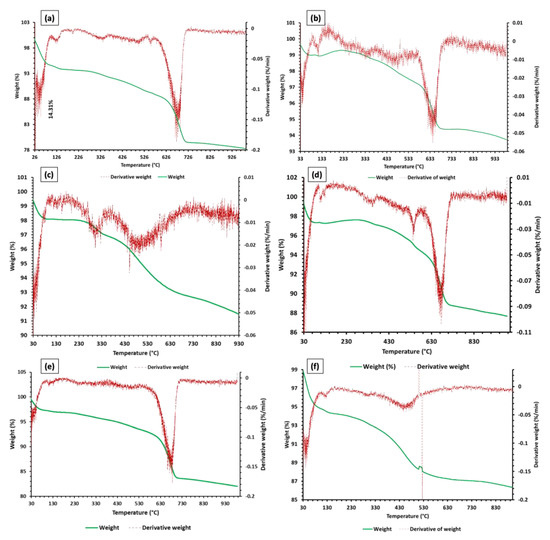TGA was used to estimate different types of calcareous and clay minerals. These minerals were distinguished by assessing the temperature at which different peaks appear. Each clay type studied had a different response to temperature and corresponding weight loss (see Figure 9a–f). The total weight loss of Clay I, Clay II, Clay III, Clay IV, Clay V, and Clay VI during TGA is equal to 21.57%, 6.14%, 8.73%, 12.12%, 17.83%, and 13.95%, respectively. The total weight loss is divided into different processes such as oxidation of organic matter, dehydroxylation of the clay minerals, and decomposition of carbonates, hydroxides, sulfides [67,70]. The high weight loss in clay types is greatly influenced by the amount of clay minerals; thus, the order of clay minerals based on weight loss can be ordered as Clay I > Clay V > Clay VI > Clay IV > Clay III > Clay II, which will be discussed in detail in Section 3.1.4.