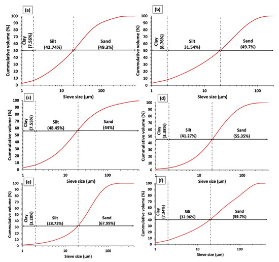 Figure 10a–f presents the gradation curve of clay specimens, wherein variable sand, silt, and clay fractions are specified as per the International Society of Soil Science [75]. The plotted gradation curves are required to critically examine the different particle sizes in a clay specimens and evaluate their effect on the parameters that impact properties such as swell behavior, activity, and PI. In view of this, the mean sizes of sand, silt, and clay fractions contained in the specimens and the mean particle size of each specimen were considered as a whole. According to Figure 10a–f, the sand fraction of clay specimens is in the order of Clay V > Clay VI > Clay IV > Clay II > Clay I > Clay III, which are related to the particles with an equivalent spherical diameter greater than 20 μm. The silt fraction is in the order of Clay III > Clay I > Clay IV > Clay VI > Clay II > Clay V, which represents the particles with a diameter between 2 μm and 20 μm. Finally, the clay fraction is in the order of Clay II > Clay I > Clay III > Clay VI > Clay VI > Clay V, which is characterized by the particle size less than 2 μm. It noteworthy that clay fractions between 16% to 40% is considered favorable for the clay-based materials [76], which is not the case in clays studied.