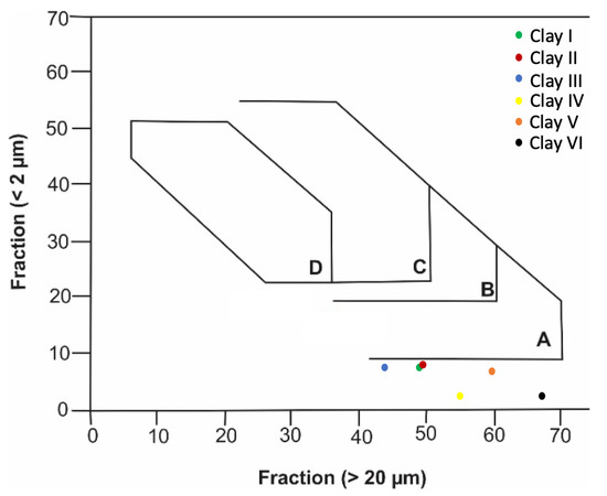 The particle size distribution of clays is also essential for determining their suitability for different ceramic applications because it could indicate the firing and drying behavior of clays and the mechanical properties of clay-based products [76]. The particle sizes for clay specimens were plotted in Winkler’s diagram to determine their suitability for different clay products (see Figure 11) such as solid bricks (A), vertically performed bricks (B), roofing tiles and lightweight blocks (C), and thin-walled hollow bricks (D). According to Figure 11, Clay I, Clay II, Clay III, and Clay V can nearly be used for solid bricks. On the other hand, Clay IV and Clay VI cannot be used for the mentioned clay-based products, which can be attributed to the presence of a low percentage of clay fraction. To make studied clays suitable for the ceramic industry, different percentages of materials (depending on the type of application) with particle sizes less than 2 μm should be added, as shown in Figure 11. In other words, the clay types studied require modification and treatment to produce clay-based products for non-structural and structural applications.