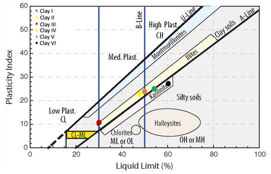 A high LL (>50%) usually suggests high swelling/shrinkage potential and high compressibility, which indicates that Clay I, Clay V, and Clay VI cannot be used in the ceramic industry without excessive compaction and implementation of improvement strategies to eliminate the risk of swelling or shrinkage. Moreover, clays with high PI generally result in low shear strength, which means that a small change in moisture percentage can considerably change the consistency [41]. Therefore, Clay I, Clay V, and Clay VI cannot be placed under the foundation of structures. It is important to note that all clay specimens also have a PL greater than 20%, which is important for ceramic applications because it determines the minimum amount of moisture required to achieve plastic conditions and high PL clays are quite difficult to dry [69]. Contrary to this, high plastic clays decrease the wearing of equipment required for milling and conformation (extruder) and possess high mechanical strength [60]. In the case of SL, the clay studied followed a similar pattern as per previous studies [81], wherein clays with higher PI have lower SL see Table A2. This is because clays with high PI would be in a plastic state at a wide range of moisture content, which varies from LL to PL; thus, require very little change in moisture content to transform into a solid state (i.e., low SL).