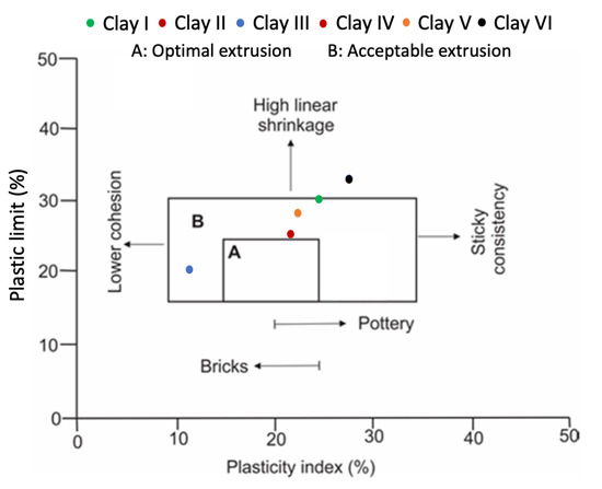 Figure 13 shows an extrusion prognostic (or workability chart) of clay specimens using index properties (PL and PI). PL is associated with the quantity of moisture needed for clay to achieve the consistency that facilitates extrusion process. While the PI corresponds to the range between plastic and sludge consistency. Therefore, for practical reasons, PI must be higher than 10% for the clays to be used in the ceramic industry [82] because extremely low PI can make the extrusion process difficult. These challenges are associated with a possible change in the quantity of extrusion water, which may cause unfavorable dimensional properties and even propagate deterioration in the green pieces. In this study, all clay types have PI higher than 10%, as shown in Table A2 and Figure 13, which will improve the efficiency of the extrusion process during the production of clay-based products. Figure 13 shows that only Clay IV is close to the optimal extrusion region while Clay I, Clay II, Clay III, Clay VI, Clay V are located in the acceptable extrusion region. On the other hand, Clay IV are unsuitable for extrusion owing to their high plasticity parameters making it unfit for the ceramic industry. Moreover, Figure 13 also shows that all clay types (except Clay III and Clay VI) are good for both pottery and brick production, while Clay III is maybe only acceptable for brick production.