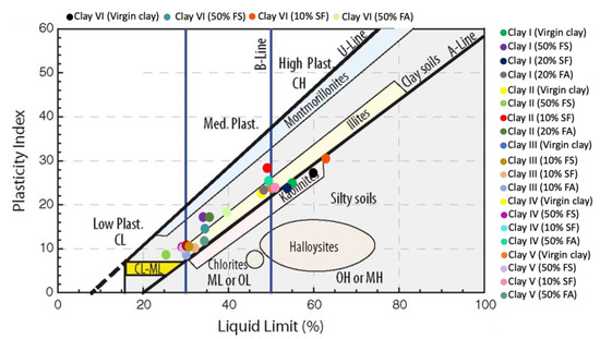 In order to see the impact of optimal percentage incorporation of waste materials on the plasticity and transformation between clays, the location of waste material-modified clays was plotted on combined Holtz and Kovacs diagram and Casagrande plasticity chart using PI and LL (see Figure 14). Figure 14 shows that incorporation of FA and FS changes clay type from inorganic clay with high plasticity to inorganic clay with medium and low plasticity, while the incorporation of SF results in opposite except for Clay I. This is because of the substitution of fine-grained particles of clays with coarse-grained particles of FA and FS, which leads to low expansive clays from medium expansive clays. In comparison to FA, FS is more effective in achieving the mentioned attributes (see Figure 14).