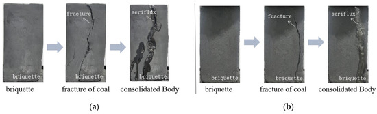 In Figure 10, the interface of the consolidation slurry and coal body was not level or smooth, and coal slurry particles staggered, in addition, the new type of slurry coal interface was relatively fuzzy, with no obvious interface phenomenon. The grout could infiltrate into the coal pores, the coal matrix further bonded together, the interfacial compatibility was good, the bonding force was strong, and the coal strength was improved. The reasons for these outcomes are as follows: the viscosity of the new grout material improved the bonding force between the grout and coal, re-cemented the coal body containing cracks into a whole, and delayed volume shrinkage until after the new grout solidified, avoiding the defects caused by volume shrinkage and grout separation from the coal matrix, thus enhancing the strength of the consolidated body.