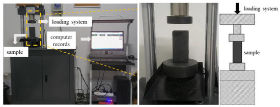 The experimental system was a single-axis compression experimental system, as shown in Figure 2. The test system adopted a YAW-300B automatic pressure testing machine, which was mainly composed of an oil source main frame, hydraulic integrated block, sensor, and PC control force measuring system. The pressure range was 0~300 kN, and the test adopted the displacement control quasi-static loading method. The axial load and axial displacement were automatically collected and recorded during the test.