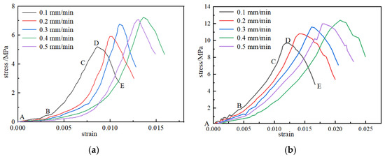 The stress–strain curves of the briquette and consolidation samples under different loading rates are shown in Figure 3. The stress–strain curves of the briquette and consolidated samples showed similar trends of change. Microdefects such as micropores and microcracks occur in briquettes, and the appearance of the compaction stage in the figure also confirms the existence of such microdefects. It can be seen from the figure that the stress borne by the consolidated body in the compaction stage (AB) was higher than that of the briquette sample, but the stress–strain curve of the briquette in the compaction stage was relatively slow, and the range of the elastic stage (BC) was shorter than that of the consolidated body. Because the internal pores and cracks of the sample were compressed during the compaction stage, resulting in slow deformation, some of the internal pores and cracks of the consolidated body were squeezed during the initial loading, and the volume of the pores and cracks that could be squeezed was reduced after grouting reloading, the briquette compaction stage was relatively slow. After grouting, the grout filled the holes and cracks, cemented the coal body, improved the cementation degree of the sample, and enhanced the strength of the sample. Under loading, the elastic deformation increases slowly, so the elastic stage is long. In the pre-peak failure stage (CD), the sample gradually reached the stress bearing limit under the continuous action of stress. At this stage, the sample slowly reached the stress peak and gradually exhibited macroscopic failure. In the post-peak failure stage (DE), when the stress of the sample reached the peak value, the stress decreased with loading, and the failure of the sample intensified. However, the stress of the consolidated body decreased relatively slowly compared to that of the briquette sample, which means that failure occurred slowly. The reasons for this trend are that grouting improves the integrity of the sample, the slurry and coal are cemented together, and the cementation ability of the sample is enhanced. As the loading continued, cracks caused by the failure of the sample were generated slowly, which was shown as the gradual loss of bearing capacity and the gradual instability of the sample.