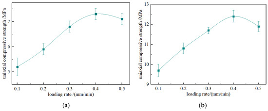 The different advancing speeds of the working face were manifested as different loading rates in the laboratory. The advance speed of coal mining faces in China is generally 2~5 m/d, and can reach 8 m/d in good geological conditions. According to the calculation formula between the field advance speed and the loading rate [29], the displacement loading method was adopted in this experimentation, and the loading rates ranged from 0.05 to 0.5 mm/min. Five intermediate grades were selected for the study: 0.1, 0.2, 0.3, 0.4, and 0.5 mm/min loading rates.