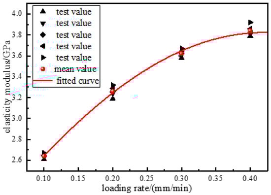 According to Figure 5, the elastic modulus of the consolidated body first increased and then decreased with the loading rate, and the distribution of the elastic modulus and loading rate was found to be Gaussian function. When the loading rate was 0.1~0.2 mm/min, the increase in the elastic modulus reached 23.5%, and when the loading rate was 0.3~0.4 mm/min, the increase decreased to 6%, and the rate of increase first increased and then decreased. This has a similar change law with the change in the compressive strength of the solidification and loading rate, that is, the distribution of the modulus of elasticity and loading rate is a Gaussian function distribution; the reason for this is similar to the previous analysis of the loading rate with the loading rate, specifically: under the load, the internal fissures of the specimen showed extrusion closure and the accumulation of elastic energy. As the loading rate increases, the internal pores and fissures of the consolidation body cannot be fully extended, the internal integrity is high, and the internal structure has a strong ability to resist deformation, so the elastic modulus increases. After reaching the critical rate, due to the existence of internal pores and cracks in the specimen, the damaged area of part of the bearing structure increases, the internal integrity decreases, the bearing capacity decreases, the stress concentration is easily formed, the bearing limit is reached in advance, leading to the destruction of a large number of internal bearing structures, and the ability of the specimen to resist deformation decreases, so the elastic modulus decreases. Its overall change trend is consistent with the change in compressive strength, which is also consistent with the relationship between the loading rate and compressive strength obtained in earlier research by other authors [31].