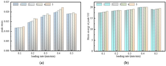 In Figure 6, with increasing loading rates, both the peak strain and elastic strain energy at the peak first increased and soon decreased. With the increase in loading rates, the internal microfractures did not fully developed, and the integrity was high. The work undertaken by the load is mainly stored in the form of deformation energy, and the dissipative energy generated by friction and extrusion between fractures is small, so the elastic strain energy at the peak is high and the strain increases. When the critical loading rate is reached, the strength of the specimen decreases, the energy consumed by the defect crack propagation decreases, the accumulated elastic energy decreases, and the strain decreases.