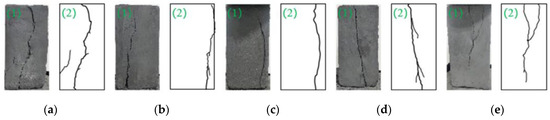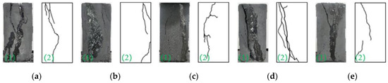 Failure types of the briquette under different loading rates. (a) η7−a = 0.1 mm/min; (b) η7−b = 0.2 mm/min; (c) η7−c = 0.3 mm/min; (d) η7−d = 0.4 mm/min; (e) η7−e = 0.5 mm/min.