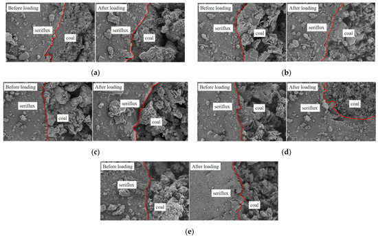 The microstructure of the briquette samples with a magnification of 2000 times is shown in Figure 9, and Figure 10 shows the SEM images at the grout–coal interface before and after loading. Figure 9 shows that the loading rates have a great impact on the pore structure of the briquette samples. As the loading rate increases, the small particles in the samples increase first and then decrease. At the loading rates of (a) and (b), the loading rates were low, the fracture degree was small, and the fracture occurred in a large particle. Due to the low loading rates, the time to reach the peak stress was long, so there was enough time for particle reconstruction and breakage, and the deformation remained small. Therefore, lower loading rates often lead to larger particles and a lower degree of specimen fracture. The loading rates of (c) and (d) were higher, and the small particles in the sample increased in number. Due to the high loading rates, the sample absorbed more energy before fracture, and the time to reach the peak stress was shorter, so there was not enough time for particle reconstruction, and the pores were not fully developed. The deformation was large and more fractures occurred during loading, so the number of small particles gradually increased. (e) When the specimen reached the critical loading rates, due to the limitation of its bearing capacity, the crack at the defect was activated and transmitted part of the stress concentration, so the bearing capacity decreased and the degree of fracture decreased.