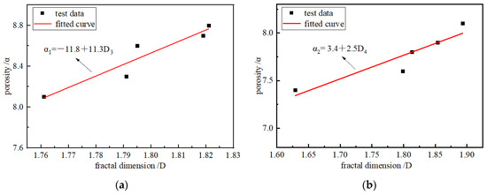 Figure 12 shows that as the loading rates increased, the FD increased first and then, according to the previous analysis, the porosity increased with the loading rates and ultimately decreased; this shows that there is a specific concern between the FD and porosity. To explore the concern between FD and pore structure, the porosity and FD relation curve is given in Figure 13, which shows the fitting. There was a linear correlation between the FD and porosity of the briquette and consolidated body.