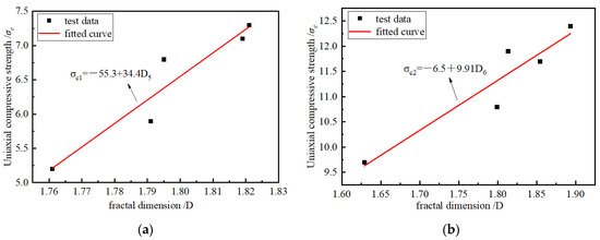 According to Figure 5 and Figure 12, with an increase in the loading rates, the UCS of the briquette and consolidated body had extreme values. The larger the UCS, the more cracks are produced in the sample, the larger the degree of fracture, the larger the proportion of small particles, and the larger the FD. The FD can further explain the sample internal pore fissure structure. To further explore the influence of the UCS of the specimen pore distribution, research on the coal and UCS of the consolidated body and the relationship between the FD and UCS of the drawing and the relationship between the FD curve are as shown in Figure 14. The fitting and FD increase as the UCS increases, reflecting a more complex internal crack structure, and the relationship between the UCS and FD is a linear function. Clearly, the larger the UCS of the briquette or consolidated body, the more complex the pore structure, and the more closely the macroscopic phenomenon corresponds to the microscopic phenomenon.