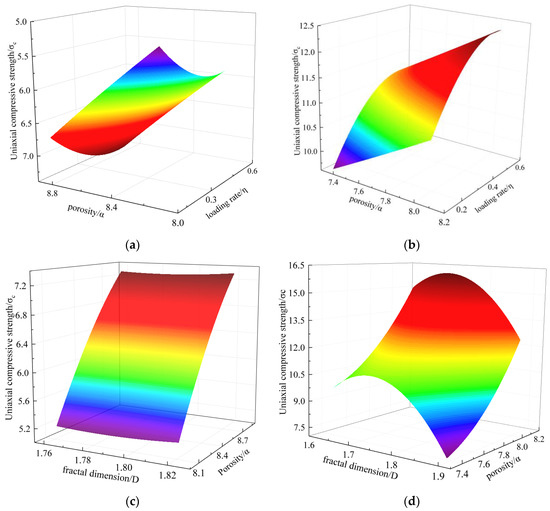 Surface diagram of the briquette and consolidated body fitting. (a) Porosity, loading rates, and UCS of the briquette; (b) Porosity, loading rates, and UCS of the consolidated body; (c) Porosity, FD, and UCS of the briquette; (d) Porosity, FD, and UCS of the consolidated body.