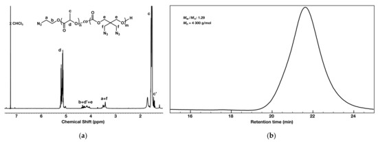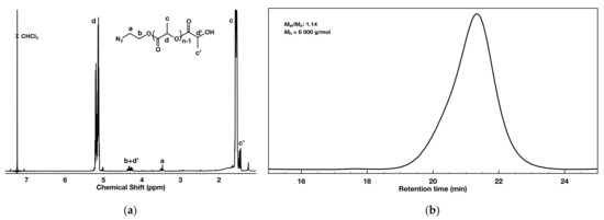 PLA-N3 polymer characterization via: (a) 1H NMR (600 MHz) spectroscopy in CDCl3; (b) GPC in tetrahydrofuran vs. polystyrene narrow-molar-mass standards.