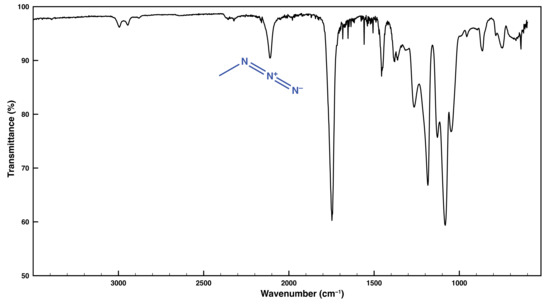 The procedure for the synthesis of multifunctional N3-PLA-co-PAMTC copolymer involved the ring-opening copolymerization of d,l-lactide and the synthesized according to the literature procedure cyclic carbonate BMTC [32]. The composition and purity of BMTC was confirmed by 1H NMR spectroscopy (Figure S2). The same functional initiator (2-bromoethanol) and catalyst (Sn(Oct)2) were used for the synthesis of multi-bromo-functional biodegradable copolymer (PLA-co-PBMTC) (Scheme 1b). The average degree of lactide polymerization was estimated from the 1H NMR spectrum of the product from the relative intensities of the methyne protons characteristic for lactide repeating units at 5.20 ppm and the oxymethylene protons of the initiator at 4.50 ppm. The degree of the cyclic carbonate polymerization was estimated from the ratio between the intensities of the two oxymethylene protons from the carbonate repeating units at 4.3 ppm and those of the oxymethylene protons from the initiator at 4.50 ppm. Thus, the copolymer obtained consisted of 54 LA-repeating units with one terminal halide group and two carbonate repeating units with four halide side groups (Scheme 1b). The last synthetic step involved nucleophilic substitution of the halide groups on the copolymer chain by azide groups through reaction with an excess of NaN3. The successful substitution reaction was evidenced by FTIR-analysis (Figure 2).