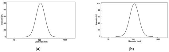 The (co)polymers were dissolved in an organic solvent mixture (DMSO:DMF = 1:1 v/v) and reacted with the excess of DBCO-PEG-oligo for 48 h at 40 °C. The spherical nucleic acids from both conjugates’ architectures were prepared by the organic solvent mixture gradual replacement with MiliQ® ultra-pure water through dialysis (membrane molecular weight cut-off 50,000 Da). Thus, PLA-SNA and PLA-co-PC-SNA spherical nucleic acids dispersed in aqueous media were obtained. The quantitative attachment of DBCO-PEG-oligo to both azido-functional polymers was confirmed from the UV absorbance at λmax = 260 nm (ε = 230,600 M−1 cm−1) of the respective spherical nucleic acid aqueous dispersions with known concentrations (Figure S3). As a result, knowing the oligonucleotide molar mass, the average molar masses of the (co)polymer–oligonucleotide conjugates were calculated as Mn = 12,000 g mol−1 for the block architecture (PLA-SNA) and Mn = 40,300 g mol−1 for the graft architecture (PLA-co-PC-SNA). The two types of spherical nucleic acid dispersions were further characterized by DLS measurements (Figure 4).