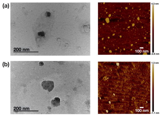 The morphology of the nanoparticles was visualized by transmission electron microscopy (TEM) and atomic force microscopy (AFM) (Figure 5). The images obtained by both methods demonstrated the formation of spherical particles. As expected, the average sizes measured by TEM and AFM on the dry deposits are somewhat smaller than those obtained from the DLS measurements in fully hydrated state. This is most likely due to the particles shrinkage upon drying during the samples’ preparation before the microscopic analyses.