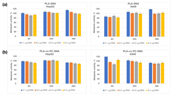 Cytotoxicity tests are widely used to determine whether the newly synthesized compounds could affect the metabolic activity of cells and if they could cause cellular damage and/or cell death. The results from this study showed that treatment of HepG2 and A549 lines with PLA-SNA and PLA-co-PC-SNA had no significant effect on metabolic activity and viability of the cells (Figure 6).