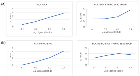 The fate of SNAs in cells strongly depends on the manner of their internalization across the plasma membrane. An important part of our research was to investigate the interactions of the newly synthesized SNAs with membrane lipids using model membrane systems—Langmuir monolayers. The surface activity of PLA-SNA and PLA-co-PC-SNA was evaluated by measuring the adsorption isotherms of their aqueous solutions. The compression/decompression of the formed monolayer was simulated by changing the nanoparticles’ concentration. The adsorption π/C isotherms of PLA-SNA and PLA-co-PC-SNA nanoparticles and Langmuir monolayers of SNAs (PLA-SNA and PLA-co-PC-SNA) and POPC (with a concentration corresponding to 30 mN/m) are shown in Figure 7. Immediately after the particles were spread, their adsorption began and the surface pressure increased up to about 4 mN/m, which corresponds to their surface activity. The higher the surface activity of the particles, the greater the adsorption on the air/liquid (150 mM NaCl solution) interphase. The relatively low values of surface activity might be due to the poor oligonucleotide compaction, which allows the access of the water molecules to the interior of some SNAs. In our experiments, at the concentrations tested, we did not observe a plateau of π values, which could indicate the critical micelle concentration (CMC). When SNAs were added to POPC films, they induced an increase in π values between 4 and 8 mN/m. The adsorption of nanoparticles to the monolayer depended on their concentration. The electrostatic interactions between the polar head of the phospholipid and the negatively charged SNAs probably results in the formation of surface aggregates and domains of POPC/SNAs, which could explain the changes in π values on the monolayer. Similar interactions of SNAs could also occur with the lipids in the plasma membrane bilayer, which is crucial for their internalization/penetration into cells. Although surface activity makes these nanoparticles promising carrier candidates, their properties need to be further evaluated. Moreover, other types of oligonucleotide-block and graft copolymer conjugates were already used to form SNAs demonstrating enhanced cellular uptake with no need to use cationic transfection reagents [19]. Our preliminary results and those already reported in the literature are optimistic for the potential application of the SNAs with polymer cores in nanomedicine.