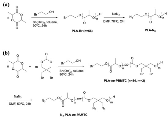Synthetic routes towards azide-functionalized polyesters: (a) azide-terminated polylactide (PLA-N3); (b) azide-terminated polylactide-co-polycarbonate random copolymer modified with azide side groups (N3-PLA-co-PAMTC).
