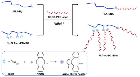 Biocompatibility and biodegradability are the main requirements for clinical application of SNAs. Therefore, the aim of the current work is to prepare novel SNA nanostructures comprised of polyester and polyester-polycarbonate nanoparticle cores. Poly(lactic acid) (PLA) is one of the most used FDA-approved biopolymers for the preparation of vaccine, drug and gene delivery systems [30]. On the other hand, during the past several years, polycarbonates (PCs) exhibiting excellent biocompatibility, nontoxic degradation products, and tunable mechanical properties have emerged as the next generation drug and gene delivery material [31]. Thus, we present a synthetic strategy for the preparation of SNAs from azide end-functionalized PLA homopolymer or azide multifunctionalized poly(d,l-lactic acid)-co-poly(2,2-bis(bromomethyl) trimethylene carbonate) (PLA-co-PBMTC) copolymer and DBCO-terminated oligonucleotides via copper-free cycloaddition. The spontaneous self-assembly of both hybrid conjugates in aqueous media is investigated. The average diameters and surface charge of the obtained SNAs are estimated via dynamic light scattering, whereas their morphology is visualized via transmission electron and atomic force microscopies. The initial in vitro evaluations such as cytotoxicity and interaction with membrane lipids are also performed.