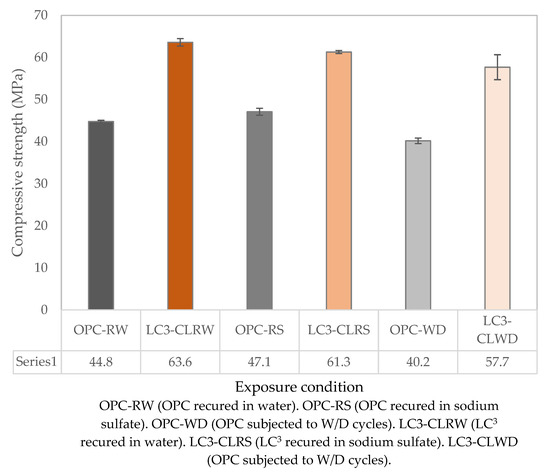 - From the results of compressive strength test carried out on samples exposed to sulfate attack and the reference samples, we can conclude that LC3 has good resistance to sodium sulfate attack. All the LC3 samples immersed in a 5% sodium sulfate solution and those that underwent wet–dry cycles attained a compressive strength of 61.3 ± 0.36 MPa and 57.7 ± 2.96 MPa, respectively. These strengths were not far off from the compressive strength of 63.6 ± 0.90 MPa, attained by the reference LC3 samples that were submerged in water.