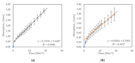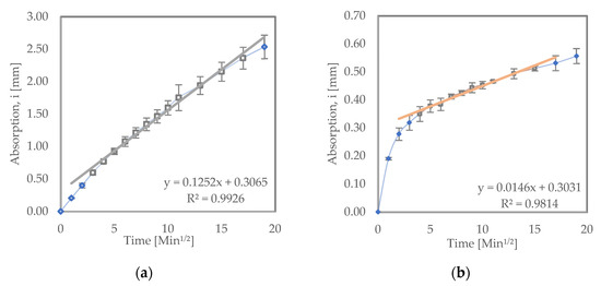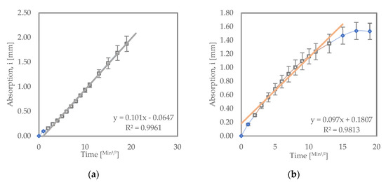 The absorption, I (in mm), is the change in weight divided by the product of the cross-sectional area of the test specimen and the density of water. More specifically, Δmt is the change in weight of the sample in grams, a is the exposed area of the specimen (mm2), and d is the density of the water in g/mm3 (taken as 0.001 g/mm3). The initial rate of water absorption (mm/√s) is the slope of the line that is the best fit to I plotted against the square root of time. This slope is obtained by using least-squares, linear regression analysis. For the regression analysis, all the points from 1 min to 6 h are used, excluding those points for times after the plot shows an apparent change of slope.