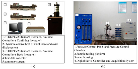 The instruments used in this test are the DYNTTS GDS triaxial test instrument (Figure 3a) and TSH-100 high-precision fixed free resonant column test system (Figure 3b) in the Institute of Geotechnical Engineering, Nanjing Tech University, as shown in Figure 3. Axial strain is the ratio of the axial displacement, produced during the triaxial compression test, to the initial height of the specimen before the triaxial compression test. During the resonant column test, the bottom of the sample is fixed to the instrument base, and the top of the sample is connected to the suspension torsion drive system; therefore, it can be considered that a lumped mass is added to the top of the sample and, through this mass block, torsional harmonics with constant amplitude can be applied to the sample within a certain frequency range [36].