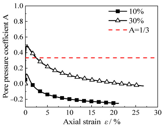 Variation curve of pore pressure coefficient A with the axial strain when C = 3.5 g/100 mL.