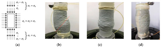 Excess pore water pressure, u, may occur in consolidated undrained shear tests [41] The pore pressure coefficient is A = u/(σ1 − σ3); the value of A can reflect the dilatancy (shrinkage) characteristics of soil failure. The pore pressure coefficient, A, is constantly changing in the undrained shear test: elastic body, A = 1/3; dilatancy of the soil, A < 1/3; shear shrinkage of the soil, A > 1/3 [41]. The variation curve of the pore pressure coefficient, A, with the axial strain of two different rubber contents is shown in Figure 5. It can be seen from Figure 5 that when the rubber content X < 20%, the pore pressure coefficient A of the cement–rubber–sand mixed soil is less than 1/3, indicating that the RCS soil has only a dilatancy effect. When X ≥ 20%, with the increase in axial strain, the pore pressure coefficient of RCS soil first indicates shear contraction (A > 1/3) and then shear dilatation (A < 1/3). Figure 6 shows the stress state and failure mode of RCS soil under different working conditions [37]. The stress state of the specimen during the test is shown in Figure 6a. It can be assumed that when the rubber content X < 20%, the force transmission skeleton in the sample is mainly from sand–sand contact. The curing effect of cement further enhances the interlocking effect between sand particles, which leads to improvement in the overall strength of the sample. The failure mode is close to that of pure sand, and the strength decreases rapidly after the formation of a 45° shear failure surface, showing strain-softening failure; that is, there is an obvious peak point in the stress–strain curve. The failure mode of strain softening is shown in Figure 6b. When the rubber content X ≥ 20%, the force transmission mode of the sample skeleton becomes primarily controlled by the large deformation of the rubber particles in the sample; the failure mode of the specimen was gradually transformed into lateral bulging deformation failure. The failure pattern is shown in Figure 6c,d and the whole sample exhibits a shear contraction trend, showing strain-hardening failure; that is, there is no obvious peak point in the stress–strain curve.