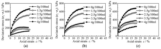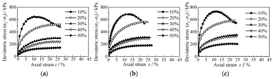 Stress–strain curves of different rubber contents. (a) C = 3.5 g/100 mL, σ′m = 50 kPa, (b) C = 3.5 g/100 mL, σ′m = 100 kPa, (c) C = 3.5 g/100 mL, σ′m = 150 kPa.