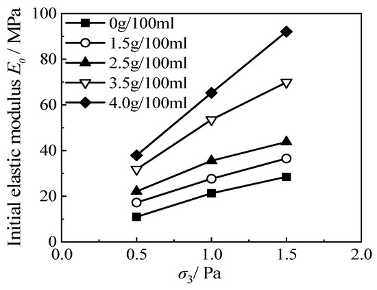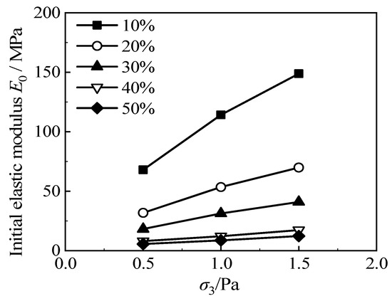 According to the assumption of linear elasticity [38,42], the part of the stress–strain curve in the range of axial strain, εa ≤ 1 × 10−5, is linearly fitted, and the slope of the fitted line is the initial deformation modulus, E0. In 1963, Janbu proposed that the initial elastic modulus, E0, is related to the confining pressure, and gave the following empirical formula [43]: