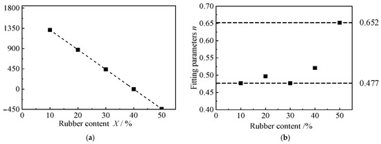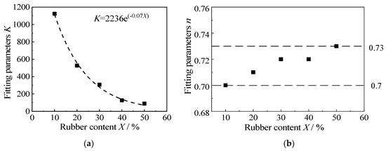 Figure 11 shows the variation of the fitting parameters, K and n, with rubber content. It can be seen that the initial modulus coefficient K decreases exponentially with the increase in rubber content, and Formula (2) can be obtained by exponential fitting:
