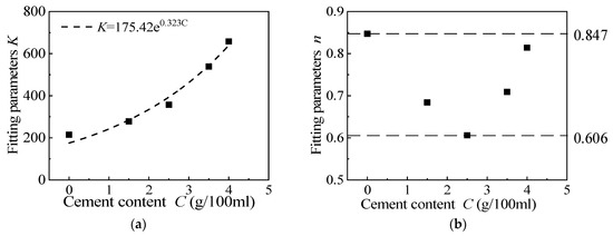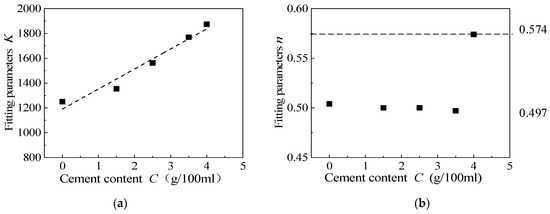 The relationship between the fitting parameters, K and n, and the cement content. (a) Fitting parameters K, (b) Fitting parameters n.