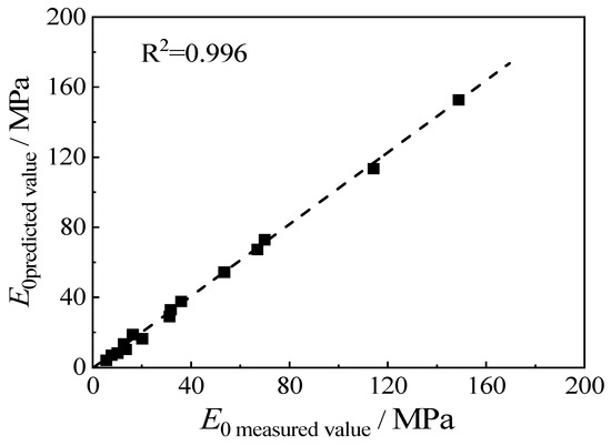 The relationship between the actual value of the initial elastic modulus, E0, and its predicted value is plotted in Figure 13. It can be seen that the scatter points are evenly distributed near the 45° line, and the fitting of R2 reaches 0.996, indicating that the predicted value is close to the measured value. It can be seen that the empirical formula of the initial elastic modulus, E0, is reliable.