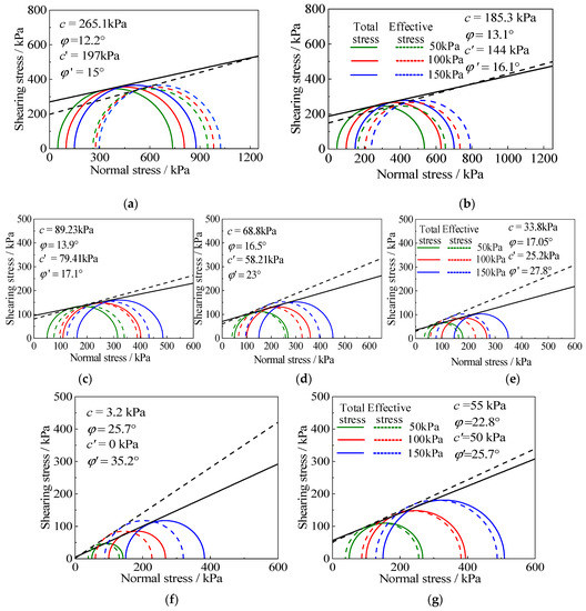 Mohr’s circle and the corresponding shear strength envelope. (a) X = 10%, C = 3.5 g/100 mL, (b) X = 20%, C = 3.5 g/100 mL, (c) X = 30%, C = 3.5 g/100 mL, (d) X = 40%, C = 3.5 g/100 mL, (e) X = 50%, C = 3.5 g/100 mL, (f) X = 20%, C = 0 g/100 mL, (g) X = 20%, C = 2.5 g/100 mL.