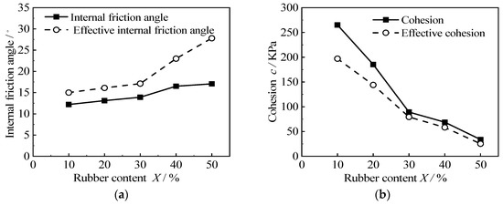 According to the above Mohr’s circle, the internal friction angle and the cohesion of different rubber contents and cement contents are shown in Table 4. This shows that the shear strength index of the RCS soil is affected by the rubber content and cement content. The relationship between the shear strength index of the RCS soil, as seen in the internal friction angle and cohesion, and the rubber content is shown in Figure 15. It can be seen from the diagram that the internal friction angle of the RCS soil increases with the increase in rubber content, and the effective internal friction angle is always greater than the total internal friction angle. The internal friction angle increases slowly when the rubber content X < 30% and increases rapidly when the rubber content X ≥ 30%. The cohesion of the RCS soil decreases with the increase in rubber content, and the effective cohesion is always smaller than the total cohesion. When the rubber content X < 30%, the cohesion decreases rapidly, and when the rubber content X ≥ 30%, the cohesion decreases slowly.