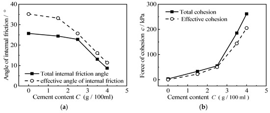 The relationship between the shear strength index, such as the internal friction angle and cohesion, and cement content is shown in Figure 17. It can be seen from the figure that as the cement content increases, the internal friction angle decreases, and the effective internal friction angle is greater than the total internal friction angle. The increase in cement content also makes the cohesion increase, and the effective cohesion is less than the total cohesion. This is because the increase of cement content strengthens the cementation structure between the particles inside the RCS soil, thereby increasing the cohesive component of the RCS soil; because the cement content is very small, the proportion of the total volume of the RCS soil is very small, so the increase in the cement content has little effect on the friction component and the dilatancy component, which doubles the measured strength of the RCS soil. The radius of the stress circle becomes larger at the same time, under different confining pressures, which means that the envelope line moves up as a whole and the cohesion increase greatly. The increase in cement content makes the stiffness of the sample larger, and the influence of confining pressure on it decreases, so that the radius of the Mohr’s circle under different confining pressures changes little, and the slope of the envelope curve decreases, resulting in a decrease in the internal friction angle.
