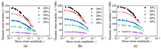 The relationship between the dynamic shear modulus and shear strain amplitude of RCS soil with different rubber contents. (a) σ′m = 50 kPa, C = 3.5 g/100 mL, (b) σ′m = 100 kPa, C = 3.5 g/100 mL, (c) σ′m = 150 kPa, C = 3.5 g/100 mL.