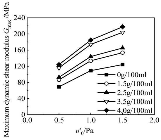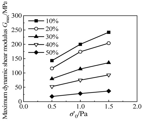 Figure 20 shows the variation of the maximum dynamic shear modulus, Gmax, of the RCS soil, with the cement content under different confining pressures when the rubber content is 20%. It can be seen that the maximum dynamic shear modulus, Gmax, of RCS soil increases with the increase in cement content.