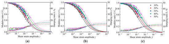 It can also be seen from Figure 18 that the influence of confining pressure on the attenuation of the dynamic shear modulus, G, of RCS soil is basically the same. With the increase in consolidation confining pressure, the occlusion between the particles inside the sample is tighter, which makes it difficult to dislocate the particles, resulting in the greater stiffness of the sample. The greater the stiffness of the sample, the stronger the shear resistance; the dynamic shear modulus, G, of the RCS soil with the same rubber content also increases.
