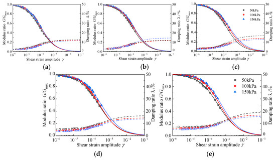 The G/Gmax~γ and λ~γ curves of the RCS soil under different confining pressures. (a) C = 3.5 g/100 mL, X = 10%, (b) C = 3.5 g/100 mL, X = 20%, (c) C = 3.5 g/100 mL, X = 30%, (d) C = 3.5 g/100 mL, X = 40%, (e) C = 3.5 g/100 mL, X = 50%.
