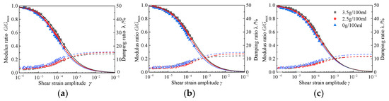 The G/Gmax~γ and λ~γ curves of the RCS soil with different cement contents. (a) σ′m = 50 kPa, X = 20%, (b), σ′m = 100 kPa, X = 20%, (c) σ′m = 150 kPa, X = 20%.
