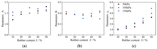 Variation of the model parameters, with the rubber content of the Martin–Davidenkov Model. (a) Parameters A, (b) Parameters B, (c) Parameters γ0.