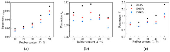 The change in the fitting parameters, λmin, λ0, and β with rubber content in the empirical fitting formula is shown in Figure 28. Three phenomena can be identified from the figure. First, the initial damping ratio, λmin, increases exponentially with the increase in rubber content; the smaller the confining pressure is, the faster the growth rate of λmin is. In addition, with the increase in rubber content, the influence of confining pressure on the initial damping is more obvious. Second, parameter λ0 characterizes the increased amplitude of the damping ratio in the strain range of 10−6 to 10−1, which is mainly derived from the results of the resonant column test, so that the fitting results fluctuate greatly, and we cannot obtain a unified law. Third, parameter β is the shape parameter that describes the increase in the damping ratio. Similar to λ0, it is mainly obtained by extrapolation, so that the deviation is large. According to the above analysis, it can be seen that λ0 and β are mainly obtained by extrapolation, and there is a certain error. Therefore, only the fitting formula of the initial damping ratio, λmin, with rubber content and consolidation confining pressure in this test is given as follows:
