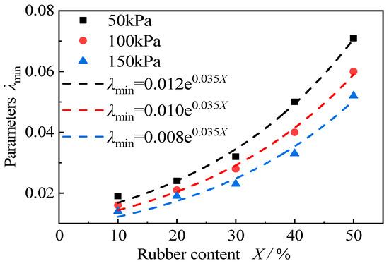 where λmin is the initial damping ratio, K and n are the fitting parameters, and X is the rubber content.