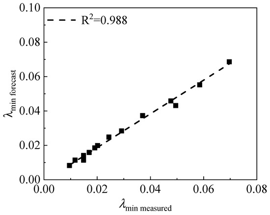 The comparison between the predicted value and the actual value of the initial damping ratio of the RCS soil under different rubber contents and cement contents is shown in Figure 30. It can be seen from the diagram that the scatter points are evenly distributed at around 45°. The fitting R2 reaches 0.988, which indicates that the predicted value is close to the measured value. It can be considered that the empirical formula of the initial damping ratio, λmin, proposed in this section is reliable.