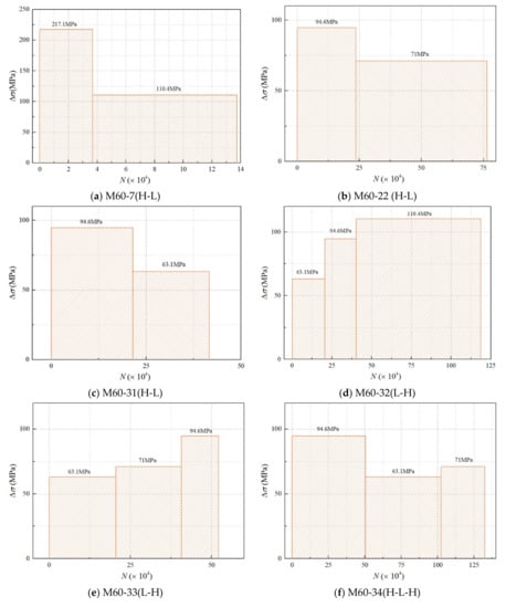 | Specimen ID | σmax (MPa) | σmin (MPa) | Δσi (MPa) | Ni (×104 Cycles) | Nf (×104 Cycles) | Loading Modes |